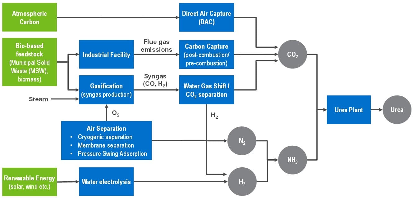 Carbon capture – This approach is defined as the separation of carbon dioxide from gas mixtures emitted by large, fixed-point sources, such as flue gases from power plants or industrial facilities. Carbon capture technologies are classified into pre-combustion or post-combustion systems, depending on whether carbon (in the form of CO2) is removed before or after the fuel is burned. Once captured from whichever process it is being emitted, the recovered carbon dioxide may then be utilized as feedstock to produce urea.