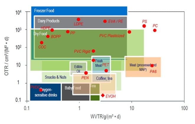 Oxygen Transmission Rate (OTR) versus Water Vapor Transmission Rate (WVTR) Requirements for Different Types of Food Products Vs. Barrier Resins Performance