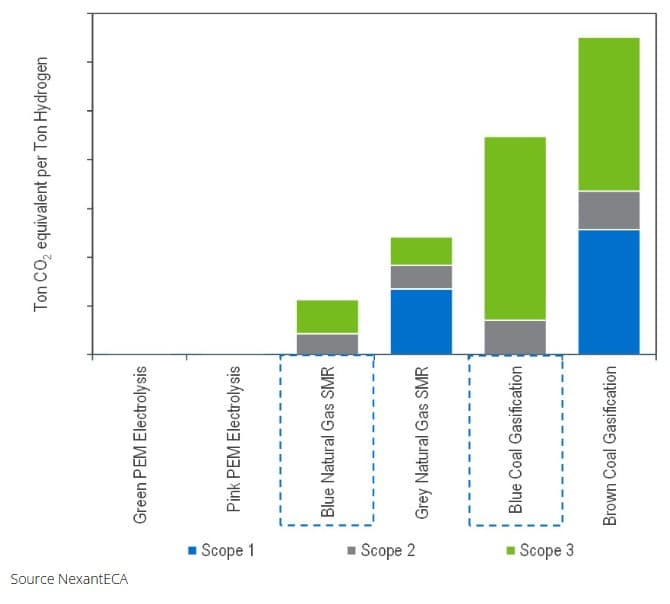Different types of hydrogen are defined based on a colour palette classifying hydrogen based on its potential environmental footprint and resulting impact. Traditionally, hydrogen has been generated from fossil feedstock using technology that emit significant amounts of carbon dioxide (CO2) and other greenhouse gas (GHGs). Depending on the fossil feedstock, hydrogen produced using conventional fossil pathways are labelled as grey (natural gas) or brown/black (coal) hydrogen. Therefore, despite hydrogen being a clean burning fuel, its production by conventional means can contribute to relatively large CO2 emissions as well as releasing fugitive methane emissions into the atmosphere.