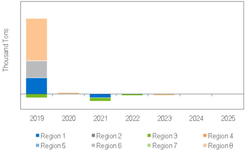 Regional supply and demand balances for product, including capacity tables of plants in each region