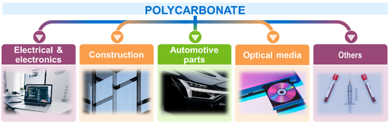 Polycarbonate is used in a range of relatively high value-added polymer applications, such as electrical & electronics, construction, automotive parts, and optical medias. Polycarbonate can be alloyed with other polymers such as acrylonitrile butadiene styrene (ABS), polyethylene terephthalate (PET), polybutylene terephthalate (PBT), or can be reinforced with glass fiber to improve its properties and lower cost.